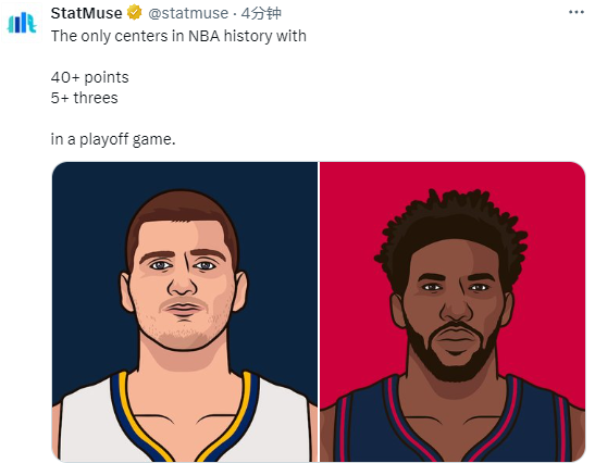 2、恩比德比肩约基奇,成为历史上第二位单场至少40分且命中5记三分的中锋