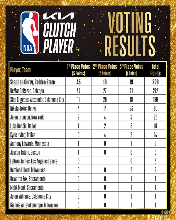 库里得到45张第一选票,最终得分是298分,德罗赞34张第一选票,最终272分。亚历山大得到160分。