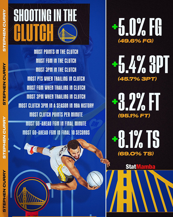 库里有10项关键数据排名联盟第一,分别是关键时刻总得分(189分)、关键时刻总进球数(59个)、关键时刻总三分命中数(32个)、关键时刻落后时的总得分、关键时刻落后时的总进球数、关键时刻落后时的总三分命中数、单赛季关键时刻三分命中数史上最多、关键时刻每分钟得分,最后一分钟反超球数量、最后10秒反超球数量。值得一提的是,库里单赛季关键时刻投中了32个三分球,打破了雷吉-米勒的纪录(22个)。