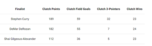 数据显示,本赛季常规赛关键时刻(比赛最后5分钟分差5分以内),库里累计得到189分,排名联盟第一,关键时刻他的投篮命中率49.6%,三分命中率45.7%,罚球命中率95.1%。德罗赞182分位居次席,亚历山大112分排名第七。