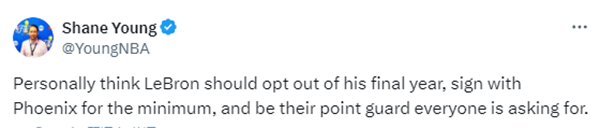 NBA记者Shane Young表示个人认为詹姆斯应该拒绝最后一年球员选项,离开湖人,然后和太阳签下一份老将底薪合同,担任球队的控卫。