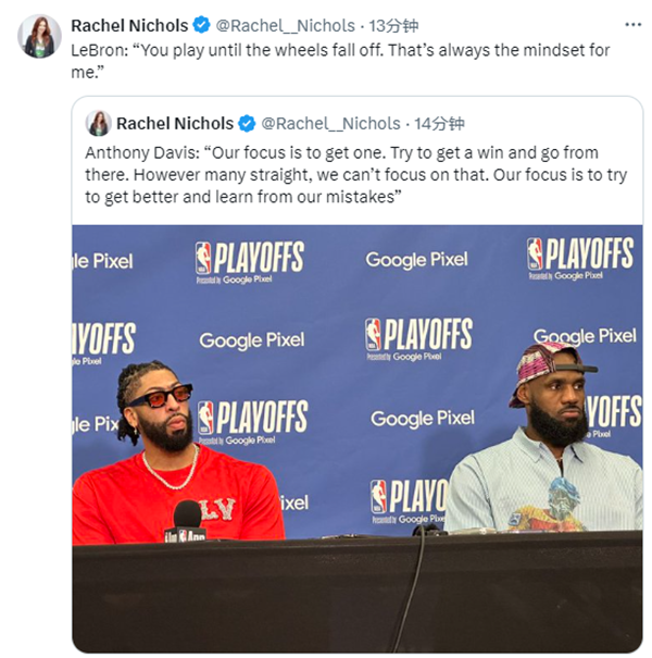 谈到系列赛0-3落后,詹姆斯表示:到了这个地步,要一场接一场地打,你输了,你就要回家了,只要你还活着,你就永远有信念。你会一直坚持下去,直到筋疲力尽,这是我一直以来的心态。说到底,这只是篮球。