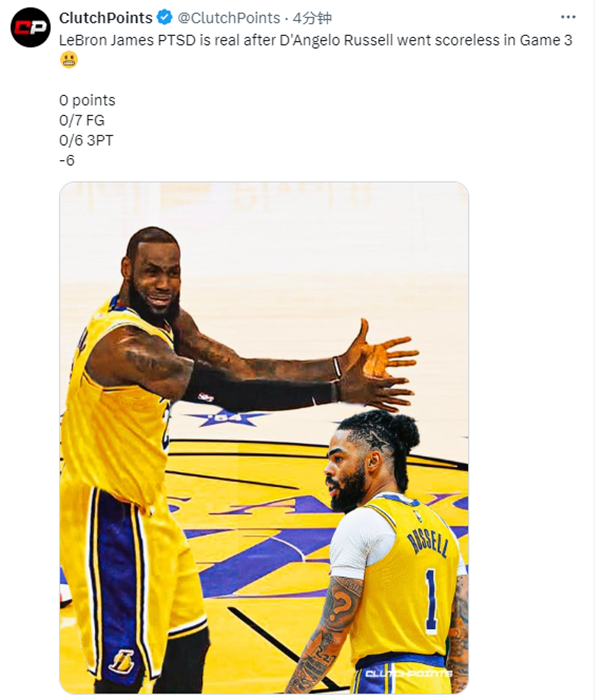 美媒ClutchPoints晒恶搞图:拉塞尔一分未得后,詹姆斯的PTSD是真实存在的。