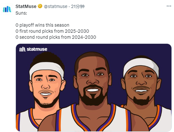 美媒StatMuse盘点了太阳未来7年的选秀权情况,从2025年到2030年,太阳连续6年的首轮签都已经被交易出去。