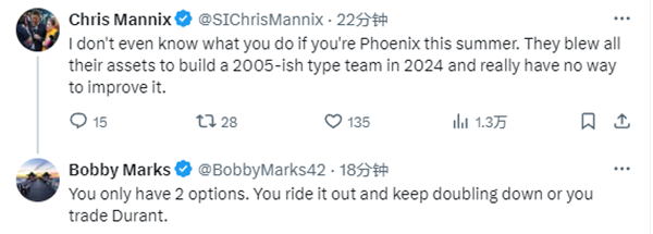 《体育画报》记者Chris Mannix发推写道,我甚至不知道如果你是太阳管理层,今年夏天你会怎么做。他们倾尽所有资产,在2024年打造了一支2005年风格的球队却没有任何进步。