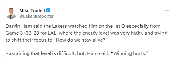 达文·哈姆表示,湖人队看了第一节的比赛录像,尤其是第三场比赛(湖人队 33 比 23 获胜,当时的士气非常高涨)的录像,并试图将注意力转移到“我们如何才能活下来?” 维持这样的水平很难,但是哈姆说,“胜利是痛苦的。