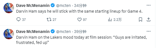 谈到拉塞尔坐在替补席吃东西而没有参加战术讨论的一幕,哈姆表示他没有看过那段视频,因为他没有使用社交媒体,哈姆还表示拉塞尔在今天的录像会议上表现得非常出色。