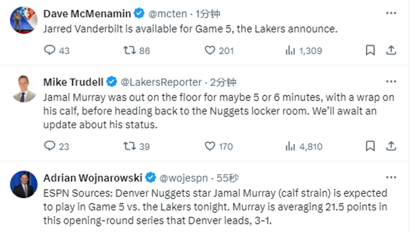今年季后赛至今,穆雷场均上场39.5分钟,能够拿到21.5分5篮板7.3助攻,他的伤情对系列赛的走势影响很大,对于穆雷的伤情,名嘴Chris Broussard表示若穆雷伤停,湖人有机会赢得系列赛,没有他,丹佛就变得不一样了。