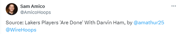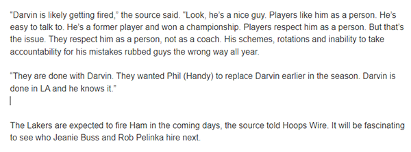 此前shams报道称湖人内部队哈姆公开场合的发言不满,他很少承认自己的错误,还有球员不满哈姆缺乏准备,湖人内部都认为哈姆导致了球队的战绩不佳,首轮G2在领先20分的情况下被掘金逆转绝杀,这成为压死哈姆的最后一根稻草。