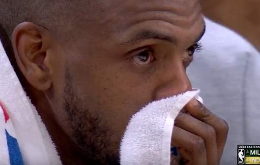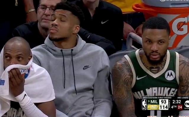 比赛最后时刻,镜头给到坐在场下的字母哥、利拉德和米德尔顿。字母哥非常无奈,仰头闭眼。这轮系列赛,他一场比赛都没有出战,作为球队的老大,他需要为出局承担责任,而利拉德则是眼神迷茫,脸色非常难看。这场比赛他的复出没有给球队带来很大的帮助。而米德尔顿同样显得很绝望,他双目空洞,这轮系列赛他是最为健康的球员,但凭借他无法带领球队前进。