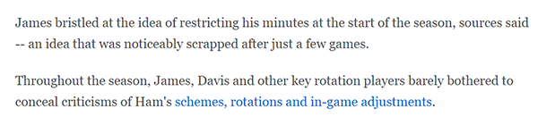今日ESPN名记Ramona Shelburne撰文分析湖人13年解雇6名主帅的原因,期间她透露了詹姆斯对教练组的另一个不满——消息人士称,在本赛季初期,詹姆斯对哈姆限制他的上场时间感到不满,仅仅过来几场比赛后,哈姆就放弃了这个做法;整个赛季,詹姆斯、浓眉和其他关键轮换球员都对哈姆的比赛计划、阵容轮换以及比赛调整很不满,他们几乎没有掩饰对哈姆的批评。