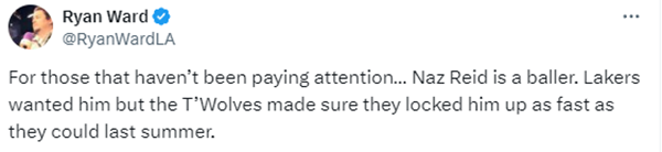 里德一个人替补拿到16分,而掘金替补席总共才拿到15分,毫无疑问,里德也是森林狼时隔20年再次在半决赛赢球的大功臣,NBA名宿加内特发推狂赞里德;湖人记者Ryan Ward发推写道别忘了还有里德,湖人曾想要他,但森林狼去年夏天很快就和他续约。