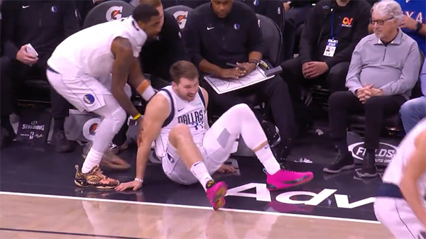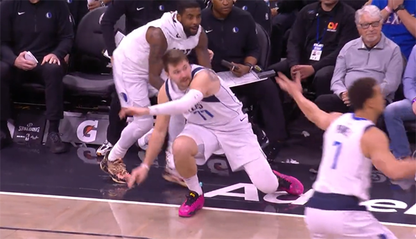 独行侠场边暖心一幕曝光:东契奇飞身救球摔出边线 欧文赶紧去扶他