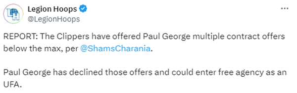 名记shams在节目中报道,快船已经为乔治提供了多份低于顶薪的续约报价,都被乔治拒绝了,快船想要留住乔治,但他可能跳出合同从而试水自由球员市场。