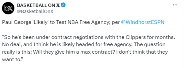 Brian Windhorst报道称,乔治已经和快船队谈判了好几个月了,他们没有达成协议,乔治很可能会成为自由球员。现在真正的问题是:快船会给他一份最高合同吗?我不认为他们想这么做。