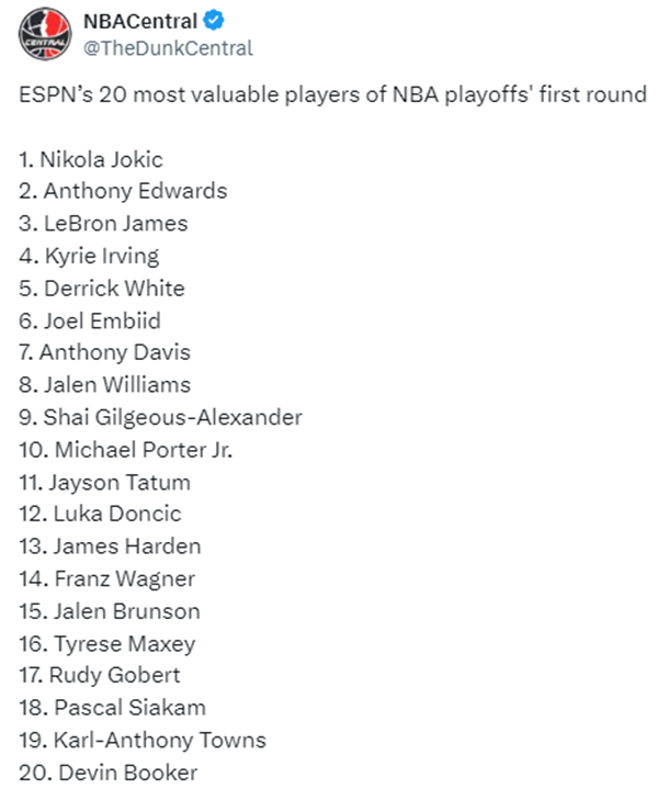 ESPN评选今年季后赛首轮TOP 20最有价值球员详情排名:1、约基奇;2、爱德华兹;3、詹姆斯;4、欧文;5、德里克-怀特;6、恩比德;7、浓眉;8、杰伦-威廉姆斯;9、SGA亚历山大;10、小迈克尔-波特;11、塔图姆;12、东契奇;13、哈登;14、弗兰茨-瓦格纳;15、布伦森;16、马克西;17、戈贝尔;18、西亚卡姆;19、唐斯;20、德文-布克。
