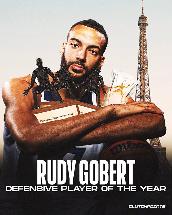 戈贝尔第四次捧起最佳防守球员奖杯 并列历史第一