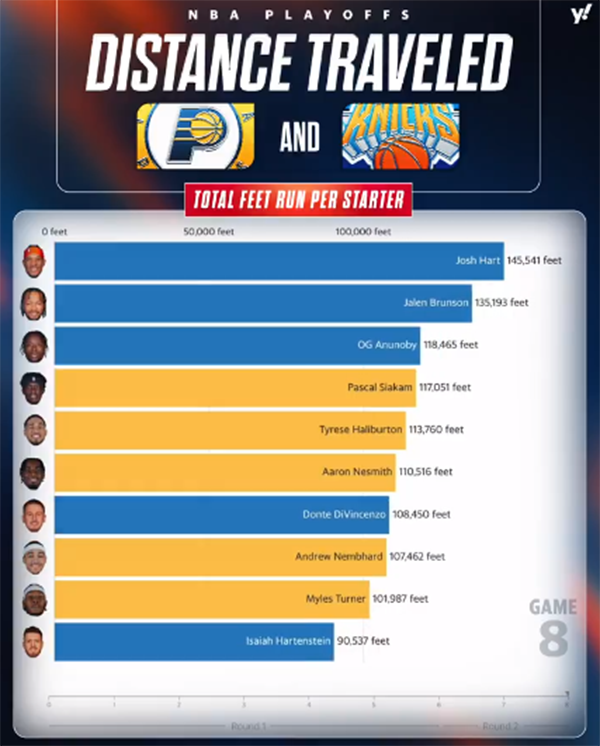 来源:JRS直播网05-11 11:36JRS直播网讯 北京时间5月11日,联盟第一铁人约什-哈特创造一项NBA历史第一纪录,据美媒统计,过去8场比赛,哈特跑了145541英尺,也就是27.56英里,约为44.35公里,哈特的跑动距离已经达到马拉松级别,成为该纪录历史首人。