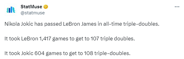 约基奇仅仅只用了604场比赛,就超越了詹姆斯的三双纪录(1417场达成107次三双),比詹姆斯少用了813场比赛。