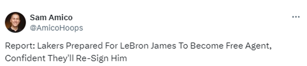 Anthony Irwin报道,了解情况的消息人士表示,湖人队已经为詹姆斯选择跳出合同做好了准备,他们也有信心与詹姆斯达成续约合同,确保他打到退役。
