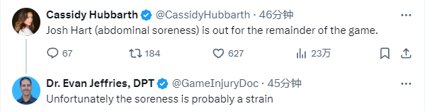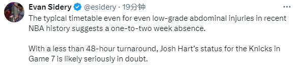 究竟哈特伤势如何?医学专家Evan Jeffries表示不幸的是腹部酸痛很可能遭遇拉伤,NBA记者Evan Sidery报道,近年来,即使腹部轻微拉伤,球员也要休息1-2周;距离抢七还剩不到48小时,哈特很可能缺席抢七生死战。