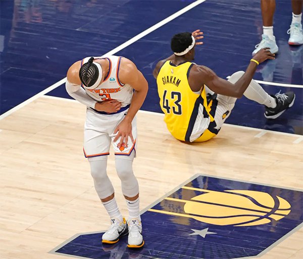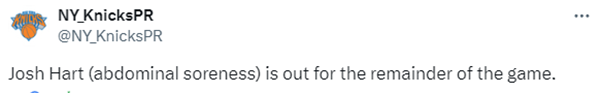 尼克斯太惨了,兰德尔、博扬、米罗都因伤提前赛季报销,阿努诺比至今没有具体复出时间,现在就连铁人哈特也伤了。
