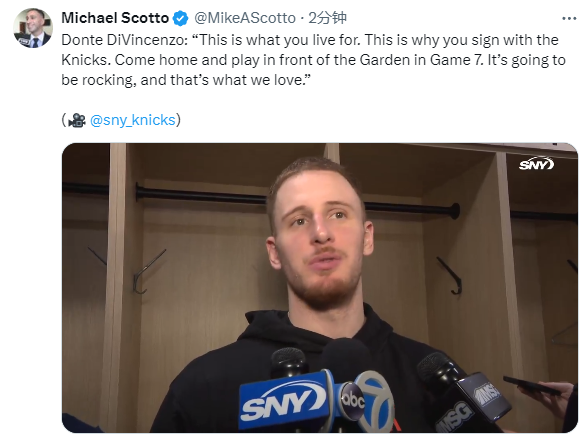 对于抢七,迪文琴佐表示:这就是你活着的意义。这就是你与尼克斯队签约的原因。回家并在花园球馆打抢七,这将是一场精彩的比赛,这就是我们喜欢的。