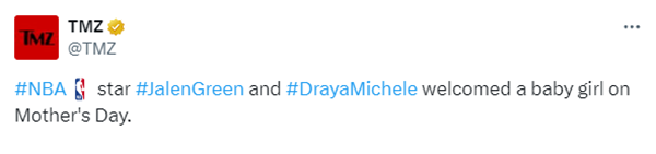 据报道,39岁的Draya Michele在INS宣布孩子在当地时间5月12日出生,表示:我的女儿被安全地带到了这个世界上,我永远感激我们在前进中所经历的新记忆;杰伦-格林虽然没在社媒宣布孩子的降生,但此前他表示对不断壮大的家庭感到兴奋。