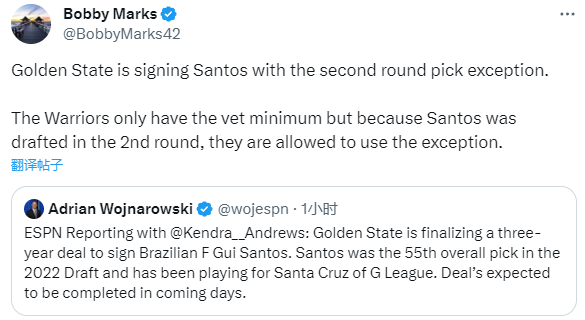 勇士将用三年合同签下1米95前锋,据薪资专家Bobby Marks进一步报道,勇士使用二轮秀特例签下桑托斯,勇士队只有底薪老将合同,但由于桑托斯是在第二轮被选中的,所以他们可以使用例外。