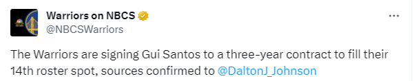 桑托斯成为勇士队大名单上的第14人,勇士14名保障合同球员——库里、汤普森、保罗、维金斯、追梦格林、卢尼、萨里奇、库明加、穆迪、波杰姆斯基、杰克逊-戴维斯、小佩顿、约瑟夫和桑托斯。