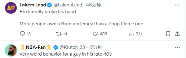 皮尔斯此举引发巨大争议,踩踏布伦森球衣是对球员的极其不尊重,美媒纷纷转发皮尔斯踩踏布伦森球衣的视频,球迷热议表示:对于一个40多岁的人来说,这种行为非常奇怪。还有球迷表示,皮尔斯的手断了,拥有布伦森球衣的球迷比皮尔斯的多。