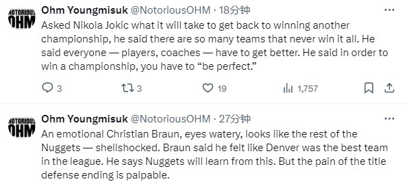 掘金悍将布劳恩情绪激动且眼含泪水,他表示掘金是联盟中最好的球队,掘金会从中吸取教训,但卫冕之路的结束显然令人痛苦。