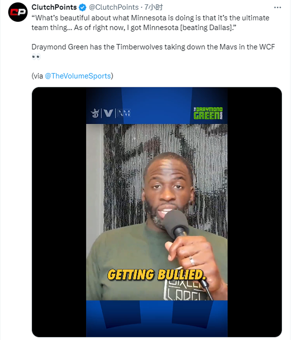 根据赛程,独行侠和森林狼西决G1将在5月23日上午8点开打,对于本轮系列赛,勇士球星追梦格林预测森林狼淘汰独行侠,追梦表示:森林狼目前所做的漂亮之处在于他们正打出终极球队之战。戈贝尔打的是大个子的篮球,在他被欺负之后,唐斯站出来接受挑战,他站出来支持爱德华兹。麦克丹尼尔斯和纳兹-里德都站出来了。就像是,这就是终极球队。我觉得这太好看了。我向他们脱帽致敬。在下个系列赛中看他们和独行侠对抗将很有意思,这个对抗将非常好看。球场上有年轻的球星,爱德华兹和东契奇。我还没有机会认真去分析,我需要看看他们的对阵。就目前而言,我认为我会选择森林狼(晋级)。