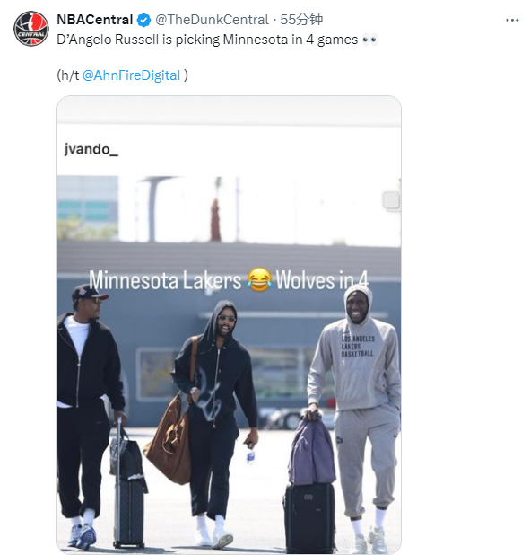 森林狼旧将&湖人球员拉塞尔更新社媒,晒照写道:明尼苏达湖人,森林狼4-0横扫晋级。
