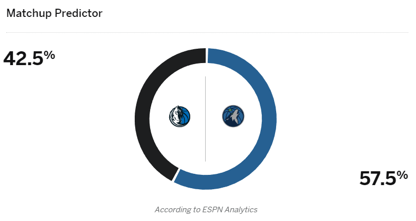 目前独行侠众将已经飞往明尼苏达,东契奇拖着行李且提着一套西装,满脸严肃的表情;欧文面带笑容一脸轻松,根据赛程,独行侠和森林狼西决G1将在明天上午8点30分开打,ESPN预测本场比赛的胜率,独行侠42.5%,森林狼57.5%,换言之ESPN看好森林狼拿下西决G1。