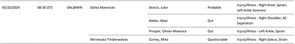 来源:JRS直播网05-22 10:27JRS直播网讯 北京时间5月22日,独行侠和森林狼西决G1伤情报告出炉,东契奇(右膝扭伤、左脚踝酸痛)大概率出战,克莱伯(右肩扭伤)和普罗斯珀(左脚踝扭伤)缺席比赛;森林狼老将迈克-康利(右小腿拉伤)出战成疑,50%可能性出战。
