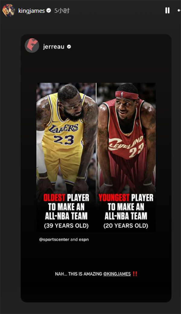本赛季年度最佳阵容已经揭晓,詹姆斯入选最佳三阵,21年生涯第20次入选最佳阵容为历史最多,连续20年入选最佳阵容也是历史且历史唯一;今日詹姆斯再次转发自己成为NBA史上最年轻和最年长入选最佳阵容球员的纪录,不得不做,这就是NBA历史最长的河。
