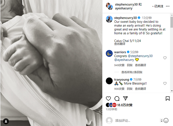 库里透露他的第四个孩子是在5月12日出生的,这是他的第二个儿子;勇士官方第一时间祝贺库里,老鹰球星特雷-杨也送上祝贺。