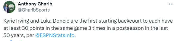 东契奇和欧文今年季后赛第3次同场砍下30+,据统计,他们是过去50年首对在一年季后赛里做到这一点的首发后场组合!