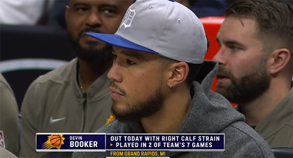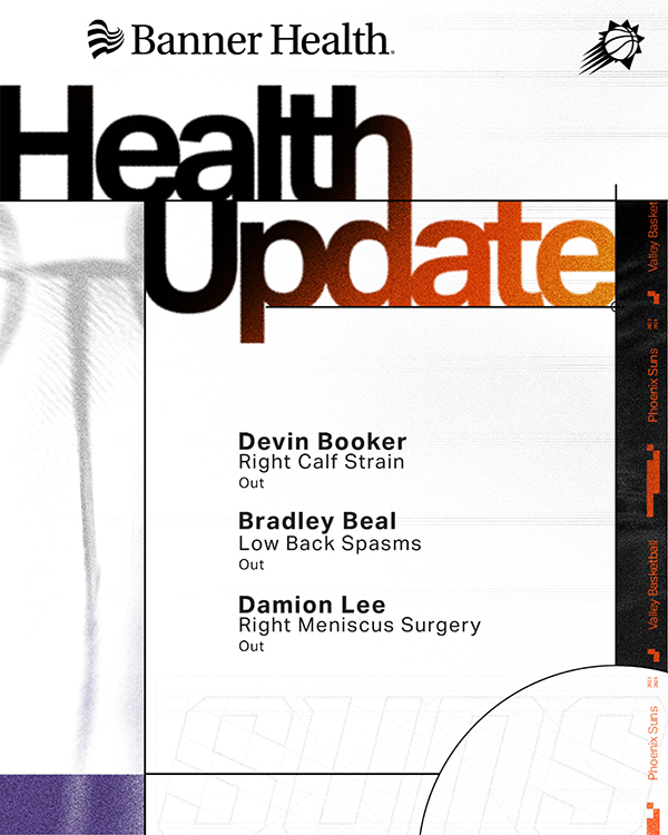 对阵活塞赛前,太阳官方宣布,布克(右小腿拉伤)、比尔(腰部痉挛)和达米恩-李(膝盖受伤)都因伤缺阵,而杜兰特没有出现在伤病报告中,继续单核带队出战。