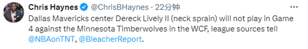 随后名记Chris Haynes跟进报道,消息人士透露,莱夫利将因伤不会出战西决G4。