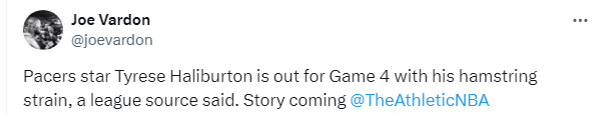 来源:JRS直播网05-28 08:49JRS直播网讯 北京时间5月28日,东决G4开打之前,名记woj报道哈利伯顿大概率缺席,之后据NBA记者Joe Vardon报道,步行者球星泰瑞斯-哈利伯顿因腿筋拉伤将缺席东决第四场比赛。