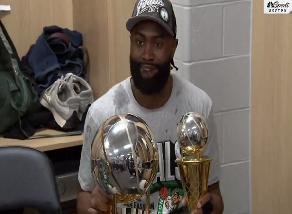 在更衣室中,布朗坐在更衣柜前,抱着东部冠军奖杯和东决MVP奖杯,开心之情溢于言表;毫无疑问,布朗是今年季后赛大赢家,晋级总决赛后,布朗达成最高奖励条件:入选全明星;常规赛出场数达标;季后赛出场数达标+闯进第二轮;闯入分区决赛和闯入总决赛,正式触发330万美元的最高奖金。
