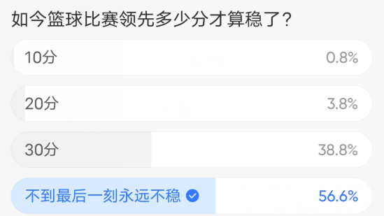 来源:JRS直播网11-06 15:39JRS直播网11月06日讯 文班亚马领军的马刺惨遭猛龙22分大逆转,究竟当今篮球领先多少分才算稳?网友投票调查,不到4成球迷认为至少领先30分才算稳,超5.5成球迷认为不到最后一刻永远不稳。