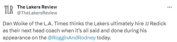 来源:JRS直播网06-01 08:47JRS直播网讯 北京时间6月1日,湖人新帅已经没悬念了吗?据湖人记者Dan Woike报道,湖人最终将聘请JJ-雷迪克担任球队的下一任主教练。