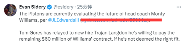 据活塞记者James L. Edwards III报道,活塞正在评估主教练蒙蒂的未来,活塞老板汤姆-戈尔斯已经向新篮球运营总裁特拉詹-兰登转达,若兰登觉得蒙蒂不合适执教球队,他愿意支付蒙蒂剩余合同中的6000万美元。