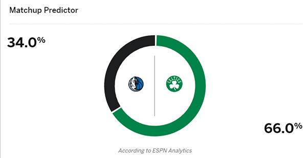 不过东契奇面对凯尔特人已经遭遇4连败,欧文面对凯尔特人则是遭遇10连败;根据伤病报道,波尔津吉斯确定G1复出,绿军全员都健康;东契奇(脚踝+膝盖受伤)大概率带伤出战,ESPN预测本场比赛的最新胜率,凯尔特人从65.7%上升为66%,独行侠从34.3%降为34%,比之前略有变化。
