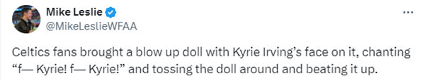 欧文抱着篮球入场,据悉他是第一个来到球馆进行热身的球员,欧文遭遇漫天嘘声以及谩骂和嘲讽,今日绿军球迷在球馆外摆烂售卖“东契奇垃圾”“欧文垃圾”的嘲讽T恤,更有球迷带着欧文版充气娃娃来到球馆外,集体狂骂欧文,甚至把欧文充气娃娃扔来扔去以及殴打它。