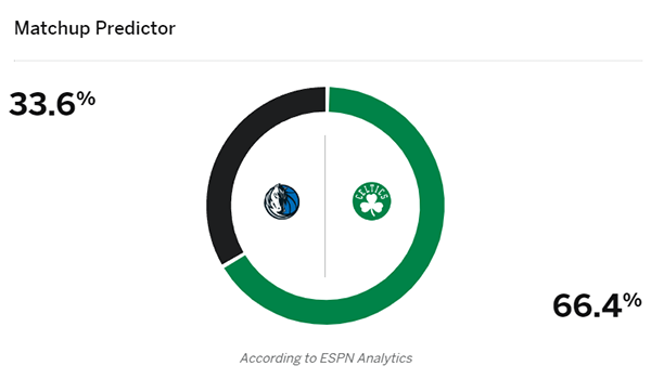 来源:JRS直播网06-08 11:24JRS直播网讯 北京时间6月8日,总决赛G1打完后,凯尔特人总比分1-0领先独行侠,今日ESPN预测总决赛第二场的胜率——凯尔特人66.4%,独行侠33.6%,很明显美媒看好绿军在主场拿下G2。