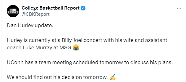 美媒表示赫尔利正带着他的妻子和助教享受音乐会,康涅狄格大学明天将召开会议讨论他的计划,明天我们就能知道他的决定了。